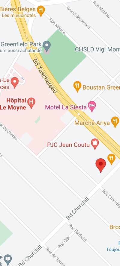 Rejoindre le boulevard Taschereau jusqu'au boulevard Churchill, à 2min de l'hôpital Charles-Lemoyne
